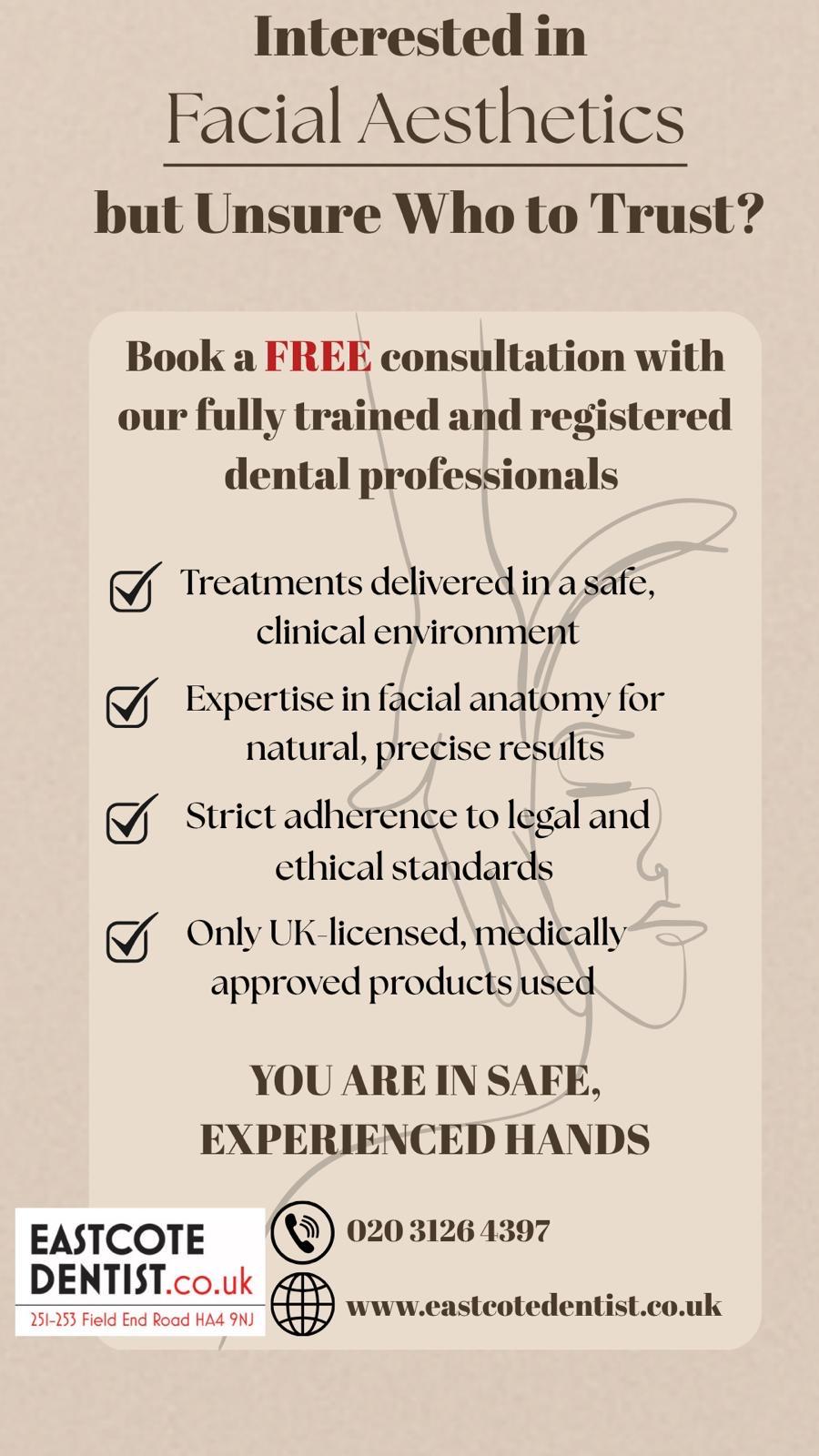 Services at Eastcote Dentist include emergency dental treatment, general dentistry, dental treatment with sedation, cosmetic dentistry, dental implants, oral surgery, Invisalign and facial aesthetics. Our clinicians have spent much effort on further training to achieve mastery in specific areas of dentistry and regularly accept referrals from other dental colleagues.